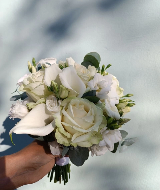Нежный и трогательный букет невесты из белых калл, розы, фрезии, эвкалипта.