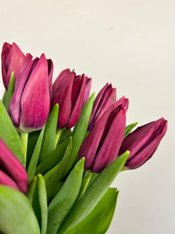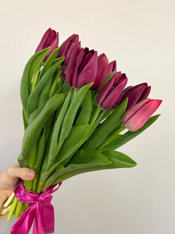 Тюльпаны — это весна в ваших руках! Подарите близким кусочек тепла и нежности.Букет из 19 бордовых тюльпанов.